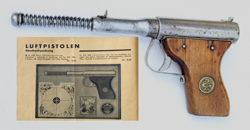 Die angebotene Laufspanner-Luftpistole ist funktionstüchtig, hat aber starke Gebrauchsspuren. Die Schussleistung ist gering, da die Feder schon recht schwach ist.