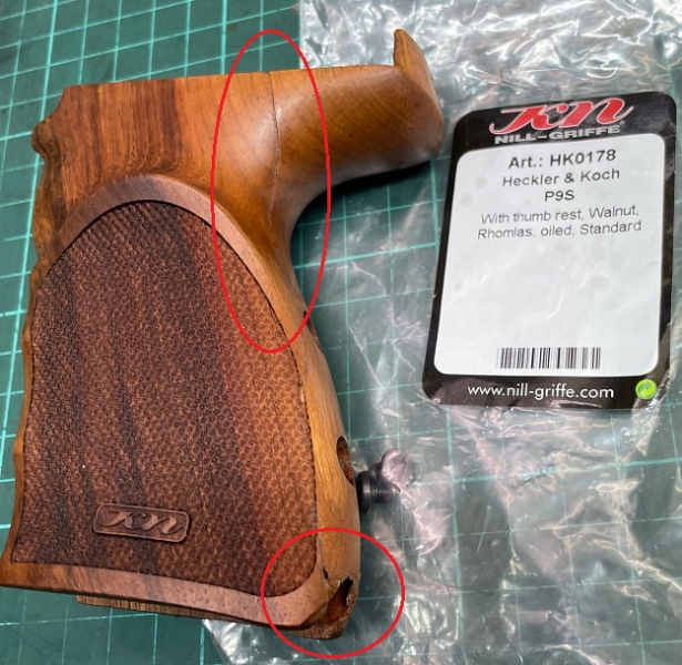 Biete einen leider beschädigten Griff von Nill, für die Heckler P9S. Der Griff kann ohne Weiteres montiert und benutz werden.