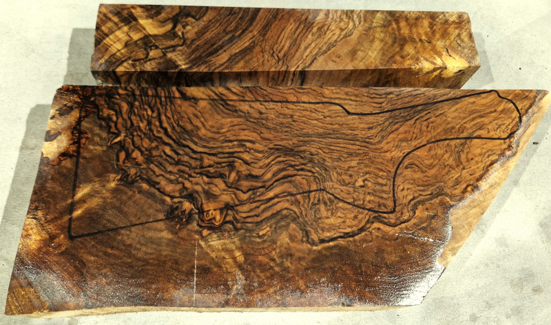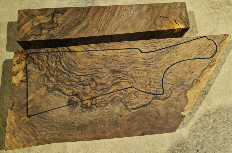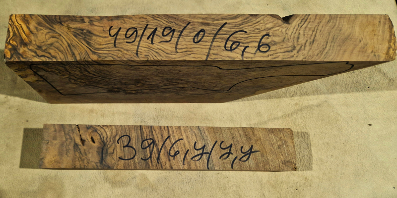 Die ersten Aufnahmen entstanden auf einem leicht angefeuchteten Holzbrett, um die Farben und die Schönheit des fertigen Produkts realistischer darzustellen. Das letzte Bild zeigt die Maße in Zentimetern. Die Konturen wurden auf die tatsächlichen Abmessungen der Blaser F3 übertragen. Die Teile wurden fünf Jahre lang luftgetrocknet. Auf Dampftrocknung wurde verzichtet, um die Farben und die natürlichen Harze des Holzes zu erhalten. Das Ergebnis ist ein elastischerer, festerer und schönerer Schaft