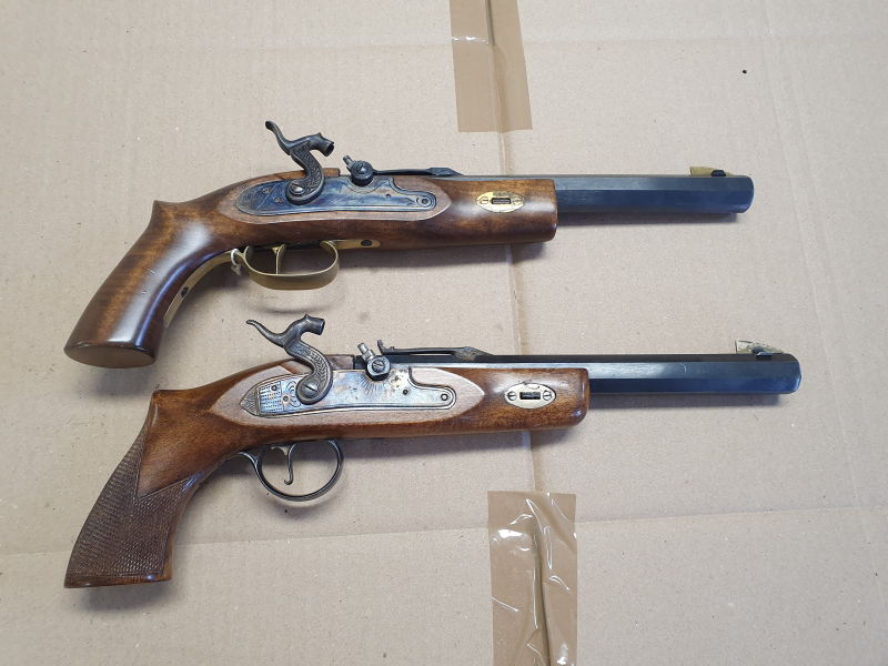 Zwei Stück Schwarzpulver Vorderlader Pistolen cal .45 Black Powder Only. Verschiedene Hersteller.