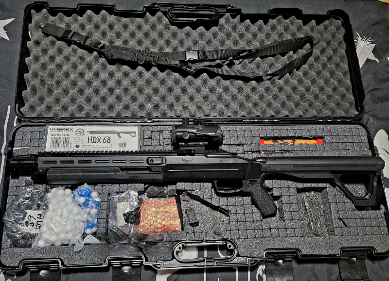 Zum Verkauf steht hier einer fast neue RAM Waffe! Es handelt sich um einer T4E HDX 68 Shotgun. Zusätzlich dann sehr umfangreiches und Zubehör Paket dabei wie z.B abschließbare Hartschalen Waffenkoffer, Pfeffer Bowls Strong, Rubberballs, Glasbreaker Balls, kreideboys, Tragegurt Red dot Visier mit roten Punkt ,grünen Punkt ,und blauen Punkt! Des Weiteren ist ein Export Ventil Set im Koffer enthalten, und mit die Waffe sollte man das Einbauen statt 7,5 Joule zwischen 30 und 40 Joule hätte! Allerdings muss ich darauf hinweisen dass dies verboten ist und man das nicht darf/ es liegt trotzdem dabei.