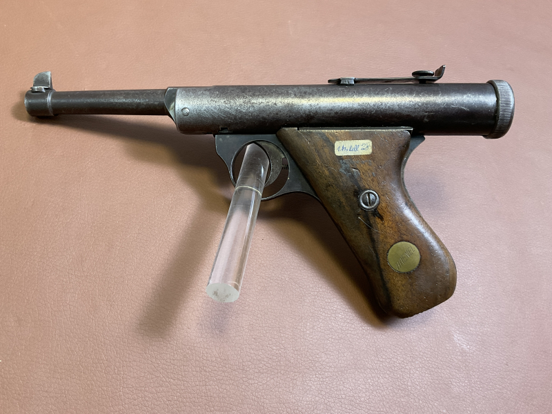 Zum Verkauf steht eine Druckluftpistole des Herstellers Haenel, Modell 28 Luftpistole. Diese Baureihe wurde im Zeitraum von ca. 1928 bis 1940 gefertigt. Die Waffe weist deutliche Handhabungs- und Gebrauchsspuren auf, ist aktuell noch schussfähig.