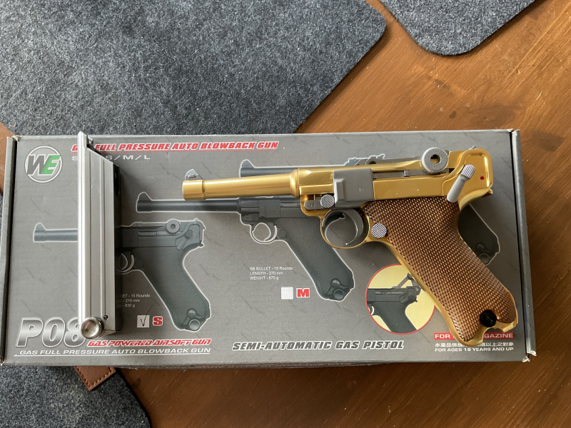 Verkaufe P08 von WE 4Zoll Blowback 6mm in gold. Waffe im neuwertigen Zustand. Keine Garantie oder Rücknahme laut EU Recht da Privatverkauf. Bei fragen bitte mailen. Paypal an Freunde Bekannte oder Gebühren übernehmen.
