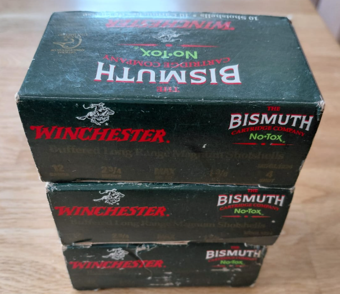 Hier drei Päckchen Wismutmunition buffer für Winchester Kaliber 12, 1,375 oz = 39 Gramm, Schrotgröße 4 = 3,25 mm. Die Päckchen habe 10 Stk. inhalt. Habe ich selbst in den USA gekauft; sie weisen leicht Lagerspuren auf.