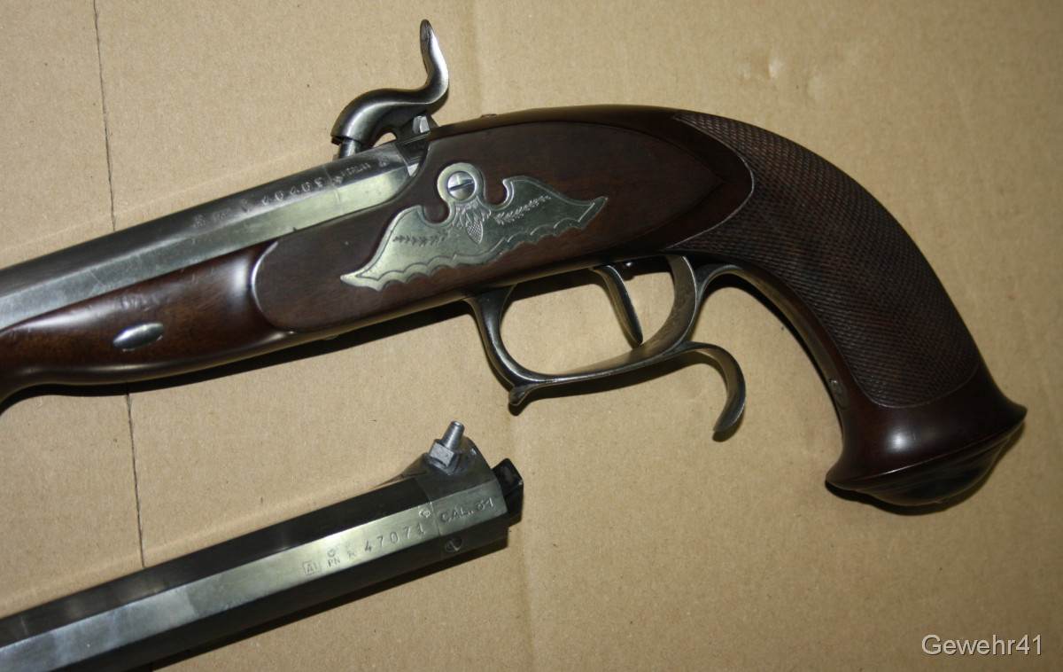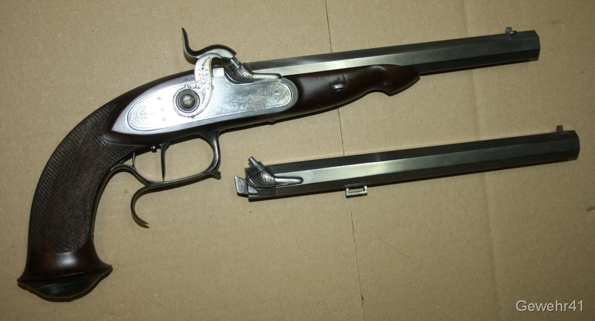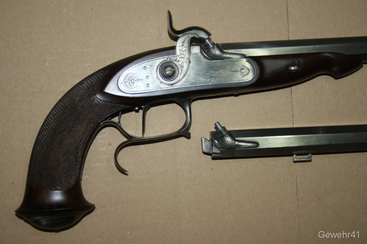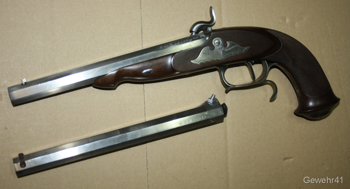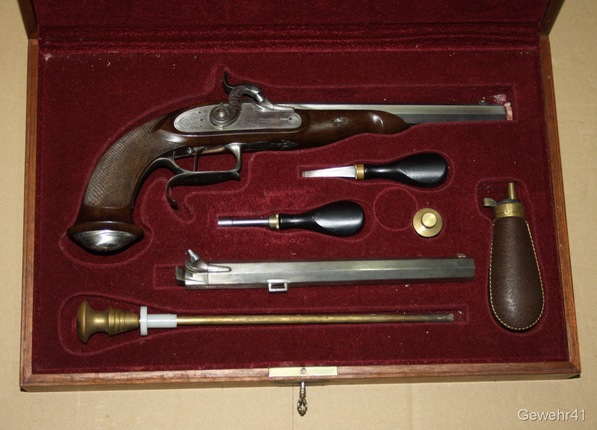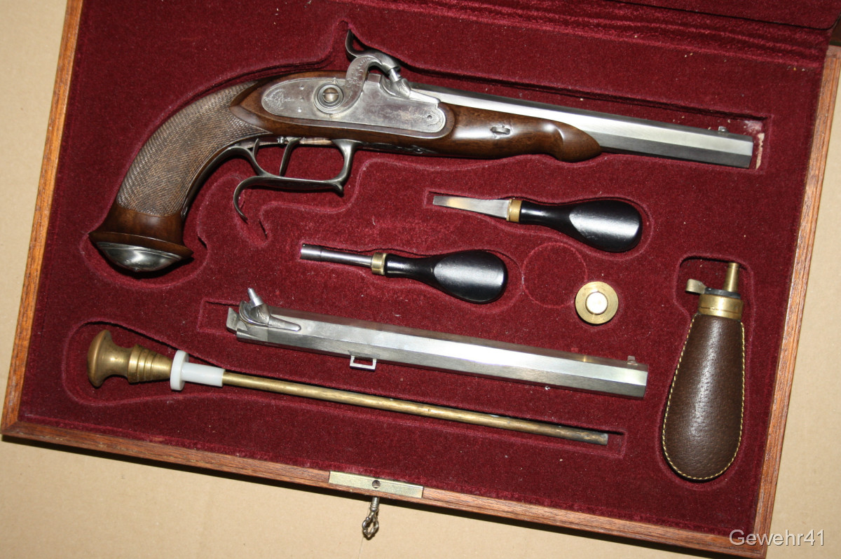 Sie bieten auf diese schöne Perkussions Vorderladerpistole "Le Page" im Kal. 44 mit dazugehörigem Wechsellauf im Kal. 31. Alles in der dazugehörigen Holz-Kiste mit Zubehör. Läufe und Funktion einwandfrei. In diesem Set selten zu finden!