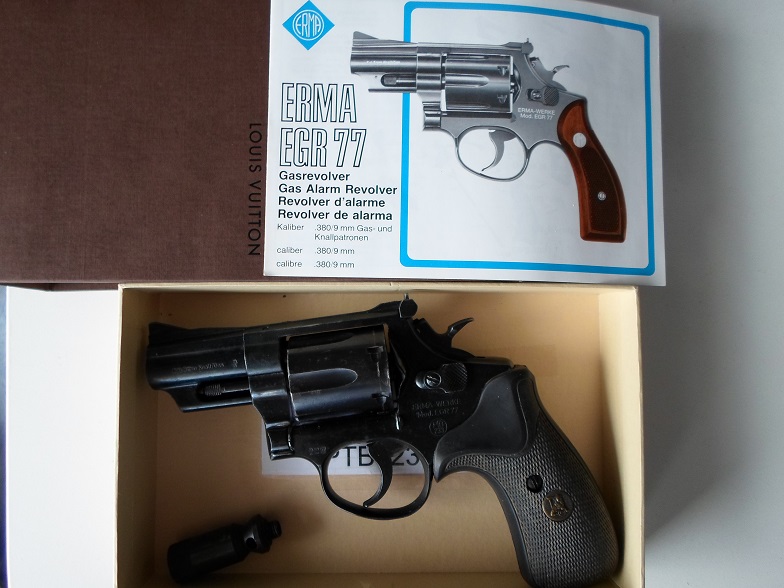 Biete einen Erma EGR 77 Revolver mit der alten, ersten PTB 233 (Beschuss 1983) mit dem Pachmayr Griff (für eine perfekte Grifflage) wie Erma ihn damals zeitweise auslieferte. Der Revolver hat teilweise deutliche Gebrauchsspuren (Siehe Fotos), ist aber natürlich voll funktionsfähig. Minimale Laufsperre, von vorne nicht sichtbar. Mit dabei die Bedienungsanleitung, Abschussbecher (nicht Original) und eine originale Louis Vuitton Aufbewahrungsbox.