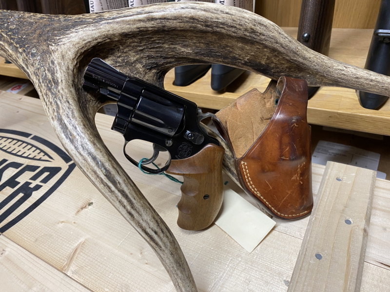 Zum Verkauf steht ein gebrauchter Revolver der Marke Smith & Wesson Modell M 36-7 im Kal. .38 Special. Der Revolver ist technisch und optisch in einem guten gebrauchten Zustand, Gebrauchsspuren vorhanden. Ausgestattet ist der Revolver mit einer 5 Schuss Trommel. Zum Lieferumfang gehört ein Lederholster. Dieses mit deutlichen Gebrauchsspuren. Auf der rechten Seite des Griffes wurde ein Wappen eingesetzt. Das Korn wurde mit weißer Farbe eingefärbt.