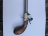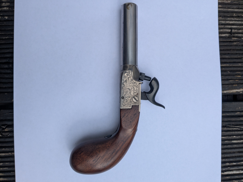Ein schöner Derringer aus einer Sammlung, nie ein Körnchen Pulver gesehen. Lauf kann man leicht abschrauben. Liegt gut in der Hand, schön graviert, was will man mehr..:-) Der abzug klappt automatisch aus beim spannen des Hahns.
