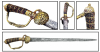 Überaus reichhaltig verzierter Hirschfänger aus dem frühen 18. Jahrhundert. Das Messing-Bügelgefäss ist reliefartig bedeckt mit Monsterköpfen und Blattwerk. Auf dem Stichblatt haben sich drei Hunde in einen Wolf verbissen. Das Kreustück aussen zeigt einen Hund und innen einen Hirsch. Gerillte Hirschhorn-Griff mit vier Lagen verdrillter Messingdraht-Wicklung. Halbkugelige Griffkappe mit Blattwerk überzogen. Abweichend von den üblichen Jagdmotiven ist die Klinge auf beiden Seiten geätzt mit einer Art sitzender Gottheit, die Arme und Beine gekreuzt hat. Eingerahmt wird das Ganze von tempelartigen Säulen und Mauerwerk.
