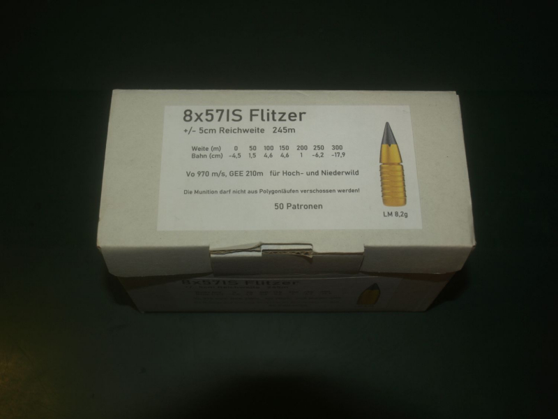 Patronen 8x57 IS mit Lutz Möller Geschoß 8,2 gr. Abgabe wg. Kaliberwechsel Es sind 4 Pakete á 50 Schuß vorhanden. Sie bieten auf ein Paket mit 50 Schuß.
