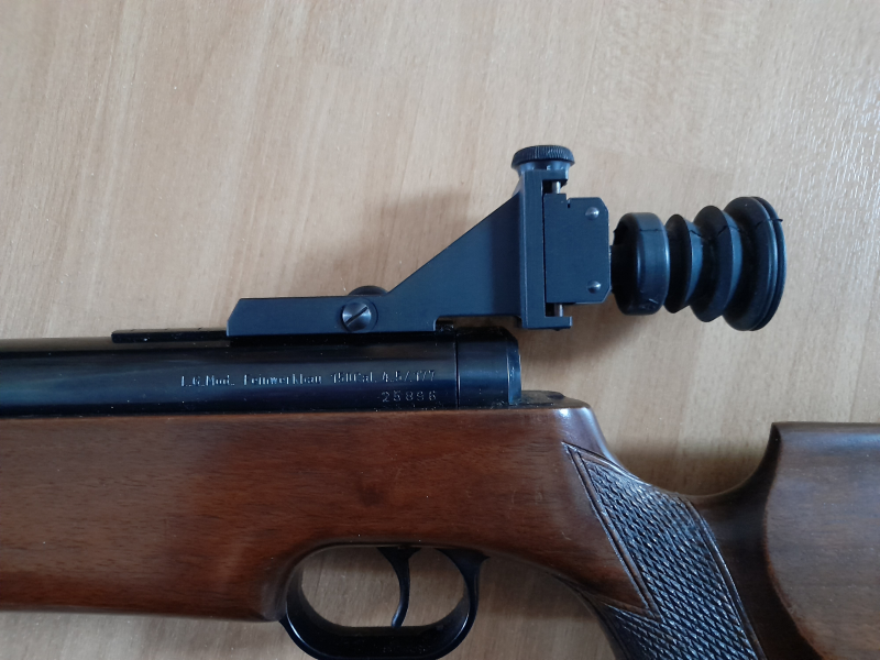 Zum Zustand: Es sieht im Großen und Ganzen noch gut aus. Kein Riss am Griff, wie es sonst bei diesem Modell sehr üblich ist. Einige Stellen haben mehr als nur ein kleines bisschen Rost. Das wäre vorne am Schaft, und am Spannhebel. Beides abgebildet. Der Schaft hat zahlreiche Druckstellen, die aber nicht weiter auffallen. Das erste, was einem auffällt, ist die zerlederte Gummischaftkappe. Sieht aus als wenn sich die jemand mal zurechtgeschnitten hat. Zum Glück leicht auszutauschen, wenn es einen stört. Beim Schießen stört es mich nicht, aber natürlich schadet es der Optik. Das andere Problem ist die Laufdichtung. Die sieht schon ziemlich bröselig aus. Ein gutes Foto davon ist mir leider nicht gelungen. Die Dichtung hält scheinbar noch komplett dicht, ich habe ca. 50 mal in den letzten paar Monaten damit geschossen. Vielleicht hält sie auch noch eine ganze Weile, wer weiß. Sie sollten sich aber auf jeden Fall auf einen Dichtungswechsel einstellen, wenn Sie hier mitbieten.