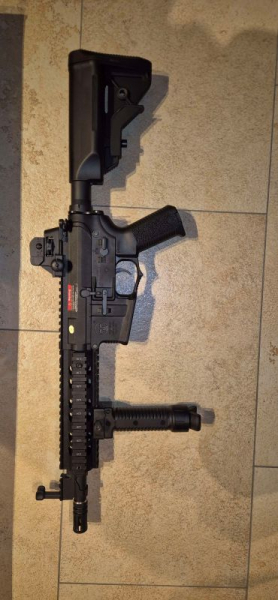 Ich verkaufe meine Amoeba M4 in schwarz, da sie nicht mehr benötigt wird. Sie wurde bislang nur einmal für ein Spiel benutzt und wurde danach nur noch dreimal zum Schießen auf Zielscheiben verwendet. Der Frontgriff mit Zweibein so wie ein High-Cap Magazin sind im Preis mit beinhaltet.Weiterhin wurde eine Aufnahme für eine Schlinge hinter der Buffer Tube angebracht.