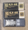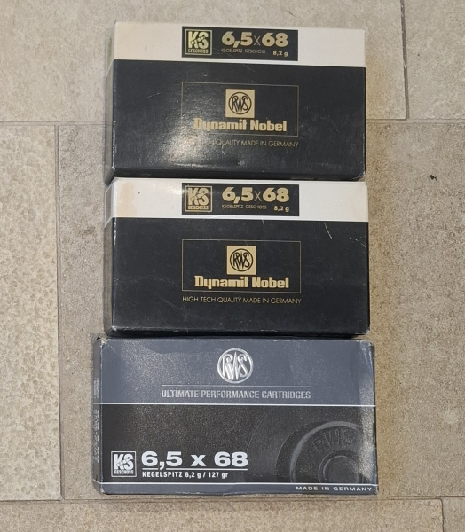 Verkaufe 3 volle Schachteln Kaliber 6,5x68, Geschoss Kegelspitz mit 8,2g. Die Schachteln sind geöffnet, die Patronen sehen aber alle homogen aus. Die beiden schwarz-weißen Schachteln sind losgleich. Die Munition war bei einer Büchse dabei, mit der ich aber bleifrei schießen muss.