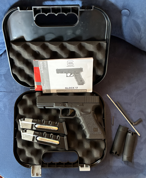 Das Original wurde vom österreichischen Waffenhersteller Gaston Glock entwickelt. Es ist das erste Modell unter den Glock Pistolen. Die Co2-Pistole ist mit einem schweren Metallschlitten ausgestattet. Der Rest besteht aus hochwertigem Kunststoff. Alle Original Markings sind vorhanden. Weitere Merkmale sind eine feste Visierung, ein gezogener Lauf, eine manuelle Sicherung, ein Single / Double- Action Abzug und eine Railschiene unter dem Lauf. Das Blowback System sorgt für ein realistisches Schießerlebnis. Der Antrieb erfolgt über eine Standard 12 g Co2-Kapsel. Das Modell kann sowohl 4,5 mm Diabolos als auch Stahl BBs verschießen. Die Magazinkapazität beträgt 8 Schuss. Im Lieferumfang befindet sich ein Original Glock Koffer.