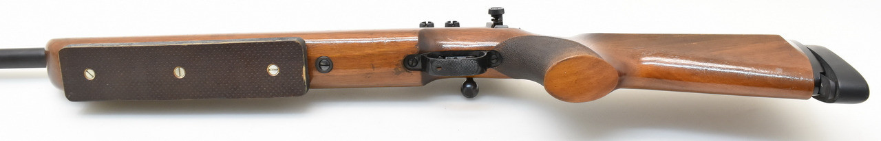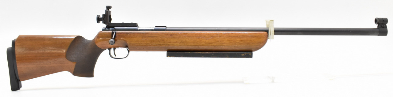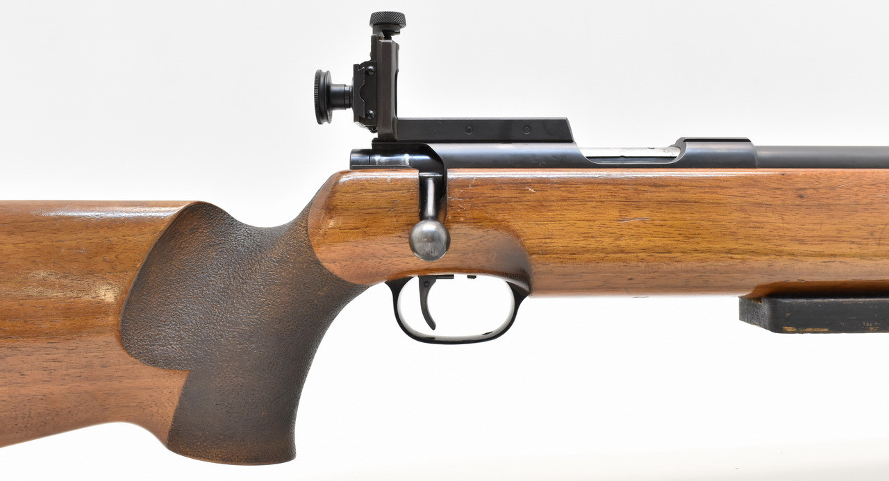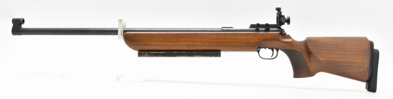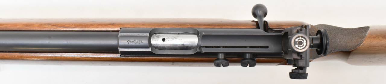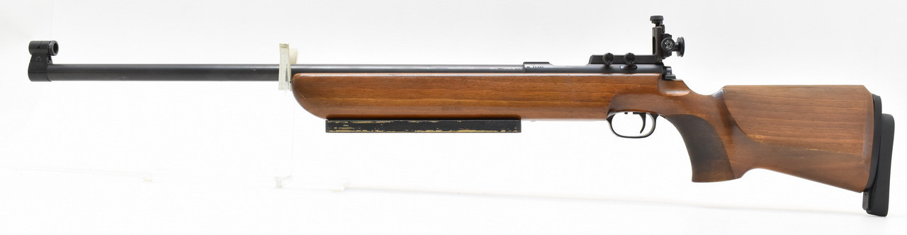 Mit Druckpunktabzug und Flügelsicherung, Auflage am Vorderschaft. 21mm starker, blanker Matchlauf. Die Schaftlänge beträgt, gemessen vom vorderen Abzug bis Mitte verstellbare Schaftkappe, 31cm. Mit Walther Diopter, Beschuss von 1965.