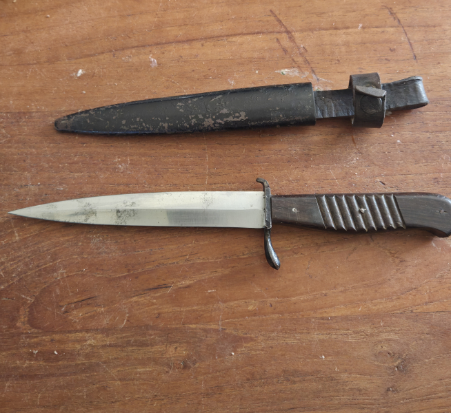 Deutscher Graben durch sehr, sehr gutem Zustand. Die Scheide und der Druckknopf sind unbeschädigt. Das Leder ist schön weich. Der Dolch ist nicht beschliffen oder sonst irgendwie verunstaltet, schöne Spitze und das ganze Stück hat noch viel von der Originalfarbe Ich denke so kaum noch zu finden