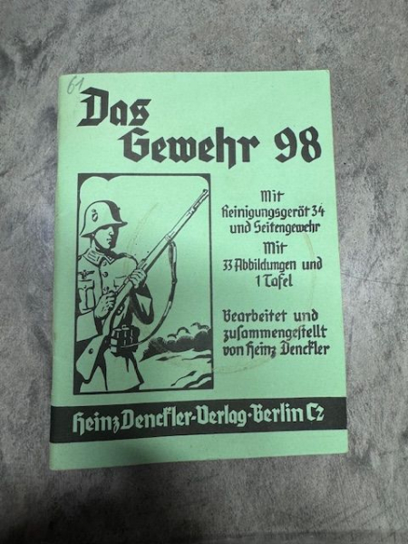 Artikelbeschreibung: Zum Verkauf steht ein historisches Dienstunterrichtsbuch mit dem Titel „Das Gewehr 98“, bearbeitet von Heinz Denckler und veröffentlicht im Denckler-Verlag in Berlin.