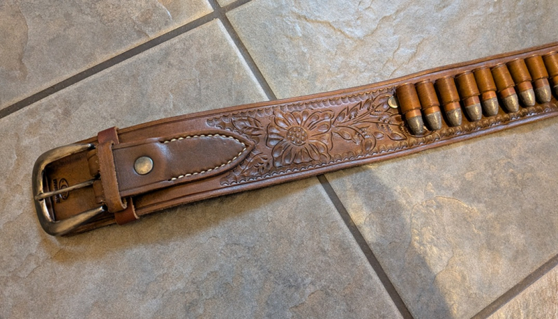 verkaufe: einen Old Style Patronengurt für .44/.45er Kaliber (24 Schlaufen) - tragbare Bauchweite: erstes Loch bei 92 cm und letztes Loch bei 106 cm - vertrieben vom Zeughaus Hege (gestempelt mit einem geflügelten Pferd im Kreis für das Zeughaus Hege sowie mit einem G im Oval und HANDARBEIT - steht wohl für den bekannten Holstermaker Garbe) - sehr schön floral punziert - dunkelbraunes Leder - ein paar Trage- und Gebrauchsspuren sind vorhanden (siehe Fotos!), keine Beschädigungen, voll verwendbar