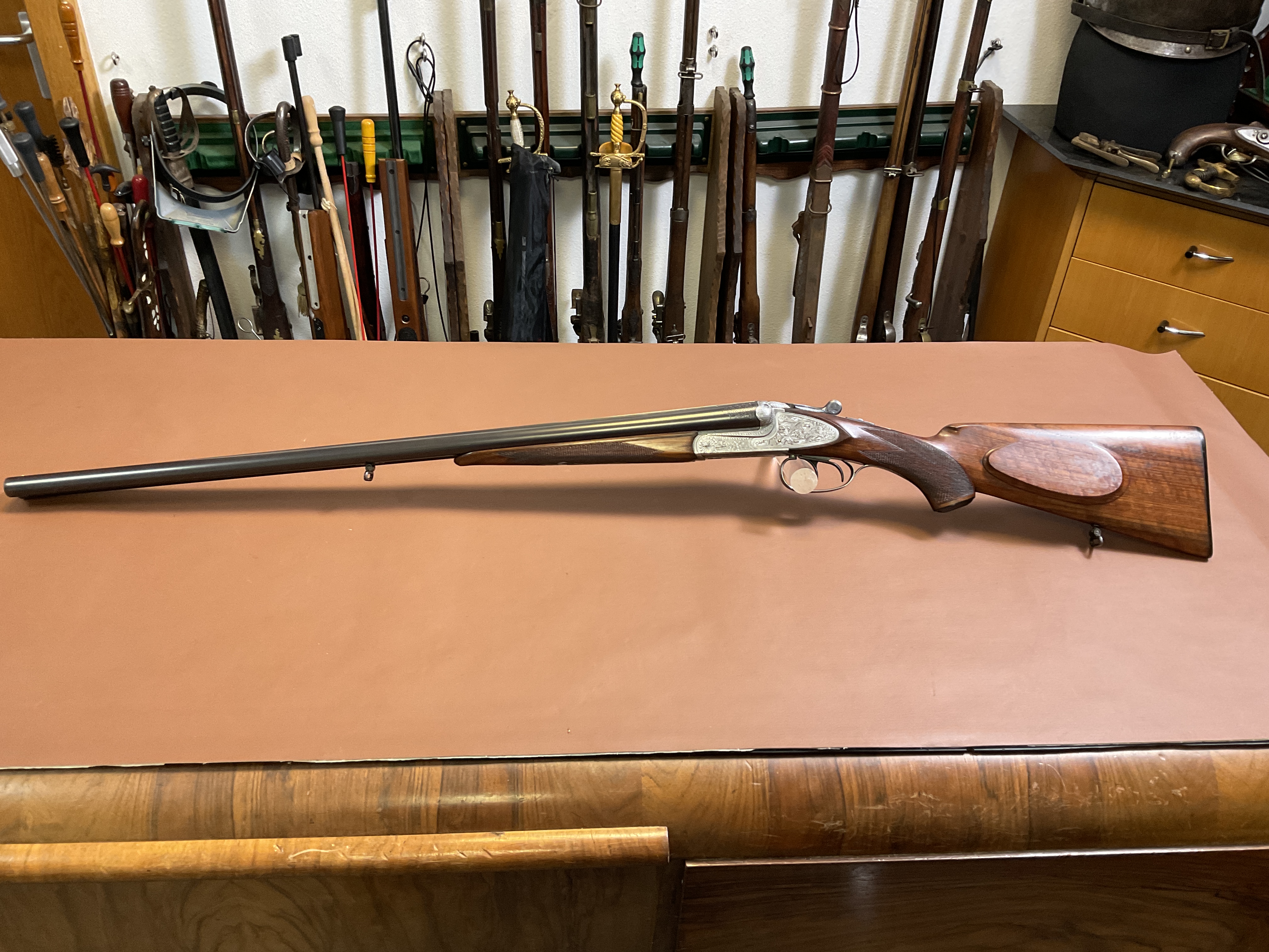 Details: • Kaliber: 16/70 • Baujahr / Beschuss: November 1968 • Lauflänge: 70 cm ,beide Läufe mit "Full Choke" • Schaftlänge (Abzug bis Schaftende): 36,5 cm • Gesamtlänge: 111 cm • Ausführung: Seitenschloss • Ausstattung: schöne Gravuren auf Seitenplatten und Basküle