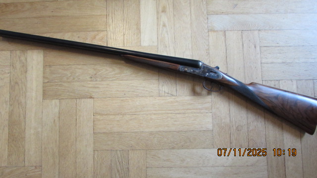 Schiebesicherung auf dem Kolbenhals, Verschluss neuwertig stramm, ohne Spiel und dicht, Ejektoren, buntgehärtete Basküle, echte herausnehmbare Seitenschlosse, vorliegende Federn, Fangstangen, Zündstifte von vorne eingesetzt, Gasauslassventile, Doppelabzug mit Ausweichzüngel, englische Schäftung am Vorderschaft mit Anson Drücker, Läufe mit konkaver Schiene, Messing Perlkorn, Chokebohrungen ¼ und 1/2 , Abschlusskappe aus einem Stück mit Hinterschaft. Beschuss ist vorhanden (kein Stahlschrot).