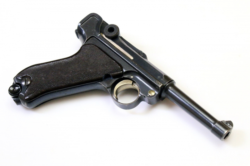 - Anmerkung: 1934 gab die Luftwaffe bekannt, dass sie Angebote für Militärpistolen einholen wollte. Es wird angenommen, dass Krieghoff die alten Erfurt-Luger-Werkzeuge von Simpson erworben hatte, um einen Vertrag über nur 10.000 Luger im Kaliber 9 mm abschließen zu können. Die Produktion im Krieghoff Werk Suhl begann 1934, Ende 1937 wurde der 10.000er Auftrag erfüllt. Damit war der frühe Militärvertrag abgeschlossen, zu dem auch diese Luger gehört. Obwohl nur wenige Exemplare mit dem Datum „G“ gekennzeichneten Kammer bekannt sind (vermutlich wurden weniger als 50 Stück produziert), handelt es sich vermutlich um die Produktion von 1934/35. Die „S“ gekennzeichneten Kammern wurden 1935 eingeführt, gefolgt von der "36" (nur ca. 500 Stück produziert) und schließlich der vollständigen Jahreszahl "1936". Danach wurden die vollständigen Jahreszahlen weiterverwendet. Extrem seltenes Sammlerstück in musealem Erhaltungszustand.