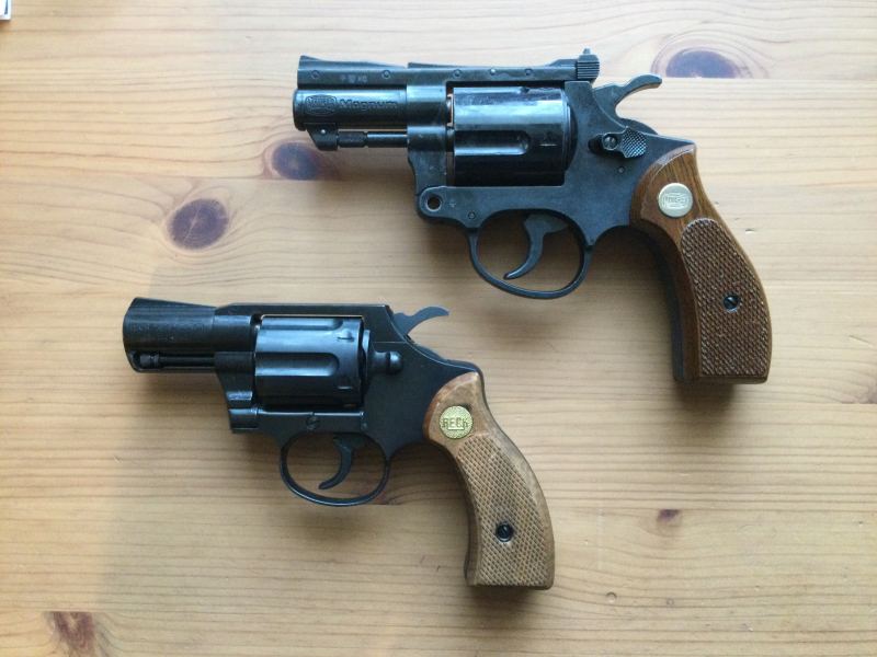 zum Verkauf kommen hier zwei Schreckschußrevolver vom Typ Reck Cobra und Mauser Magnum im starken Kaliber .45 Knall, leider ist bei dem Mauser Revolver im laufe der Jahre der Verbindungsbolzen (siehe letztes Bild) verloren gegangen, der Reck Cobra ist hingegen funktions und schußfähig.