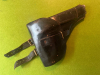 Rechtshand, Lauf geschlossen, aus schwarzem Leder, mit der typischen vorderen Magazintasche und mit einer doppelten, abschnallbaren Gürtelschlaufe wie hier auf der Rückseite