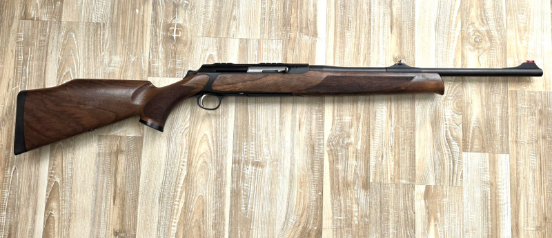Sie ist ausgestattet mit einer deutschen Backe am schönen Nußbaumschaft, sowie einer sehr praktischen Drückjagdvisierung in rot/gelb mit der ein schnelles Erfassen des Ziel kein Problem darstellt. Auch für ungeübte Schützen ist dies vorteilhaft.