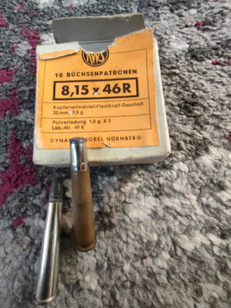 Verkaufe für einen Freund eine Schachtel Munition 8,15x46 R plus eine . Also es sind 11 Patronen .