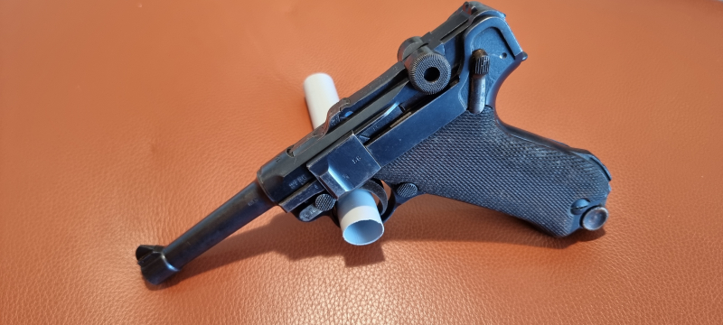 Angeboten wird aus Nachlass eine P08 Kaliber 9mm Luger. Die Waffe ist in einem guten Zustand. Hergestellt wurde sie 1918. Der Lauf weist scharfe Züge auf und ist in einem guten Zustand. Ein gültiger Beschuss ist nicht vorhanden. Die Pistole wird mit zwei Magazinen geliefert. Ein Magazin passt zu den Nummern auf der Pistole. Alle Nummern sind identisch mit einer Ausnahme. Hier wurde eine 58 eingeschlagen. Alle anderen Seriennummern lauten 56. Der Schaft und die Brünierung sind in guter Verfassung. Den weiteren Zustand können sie den Bildern entnehmen. Zusätzliche Bilder können bei Bedarf per Mail versendet werden.