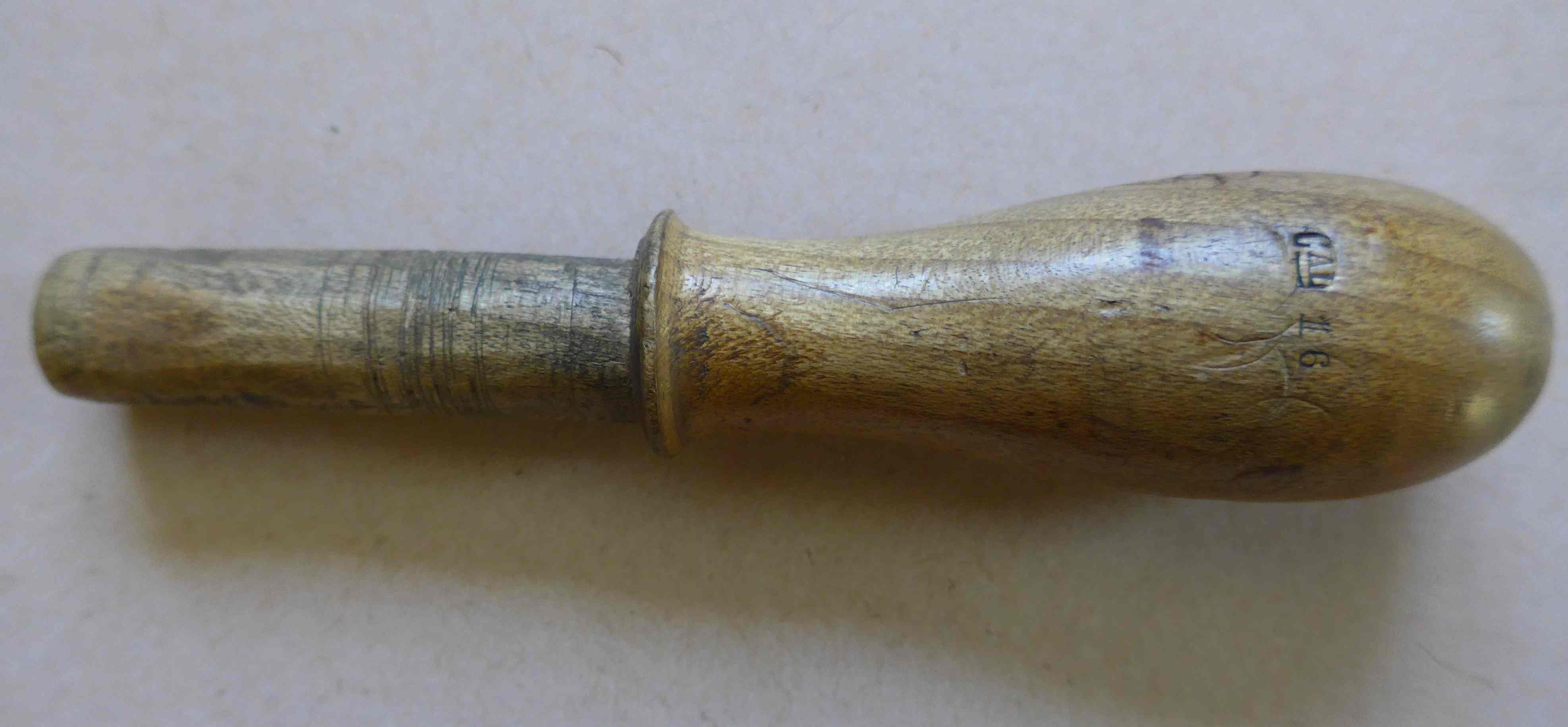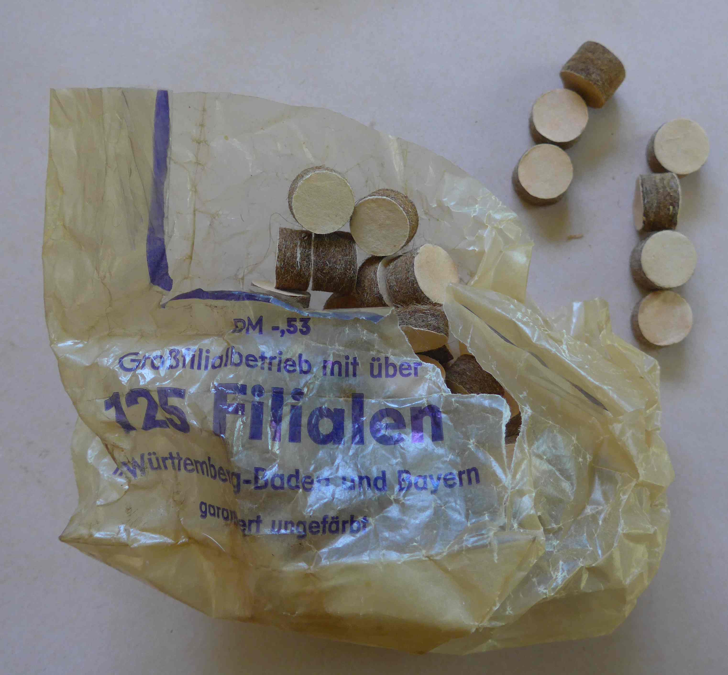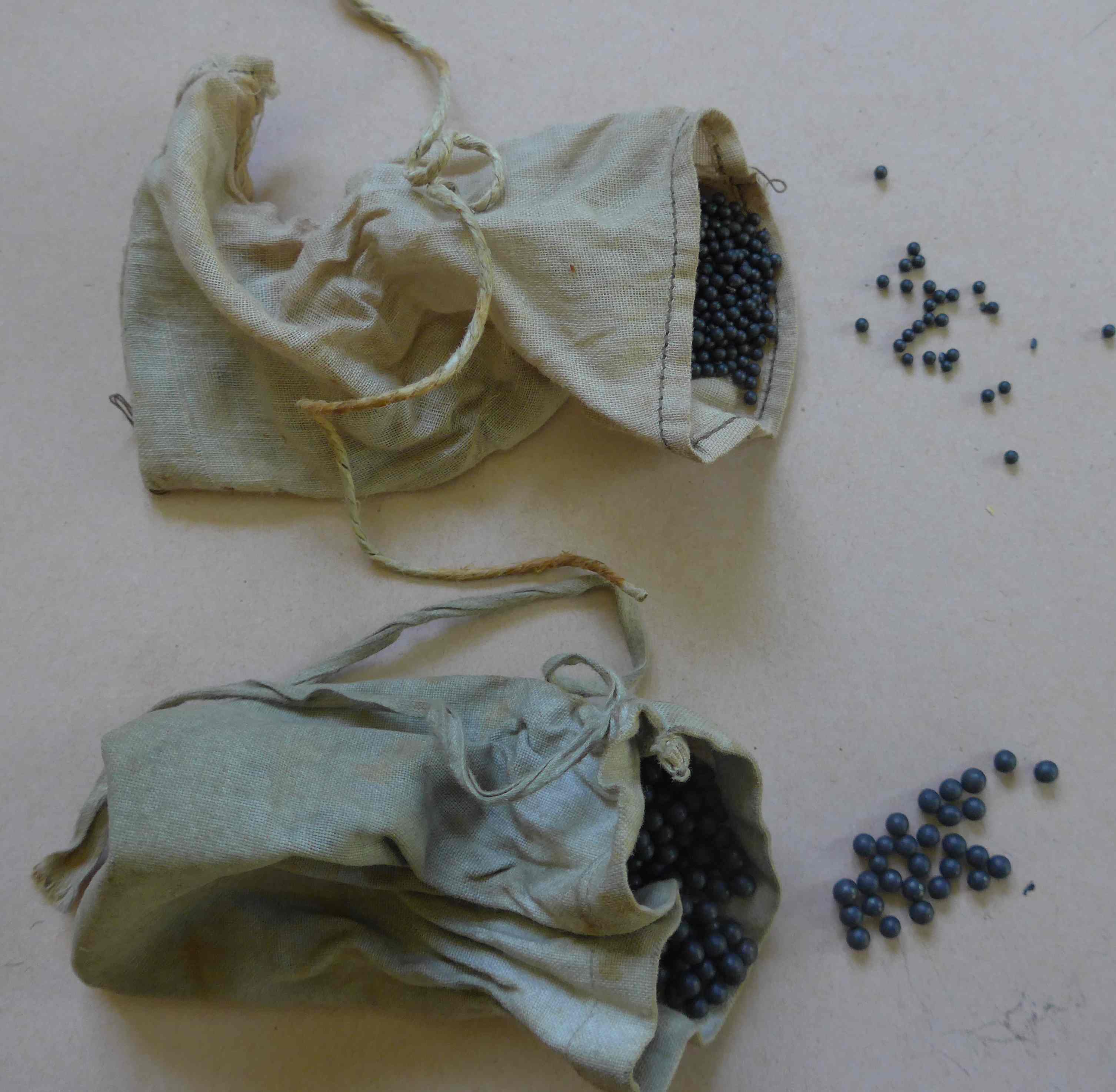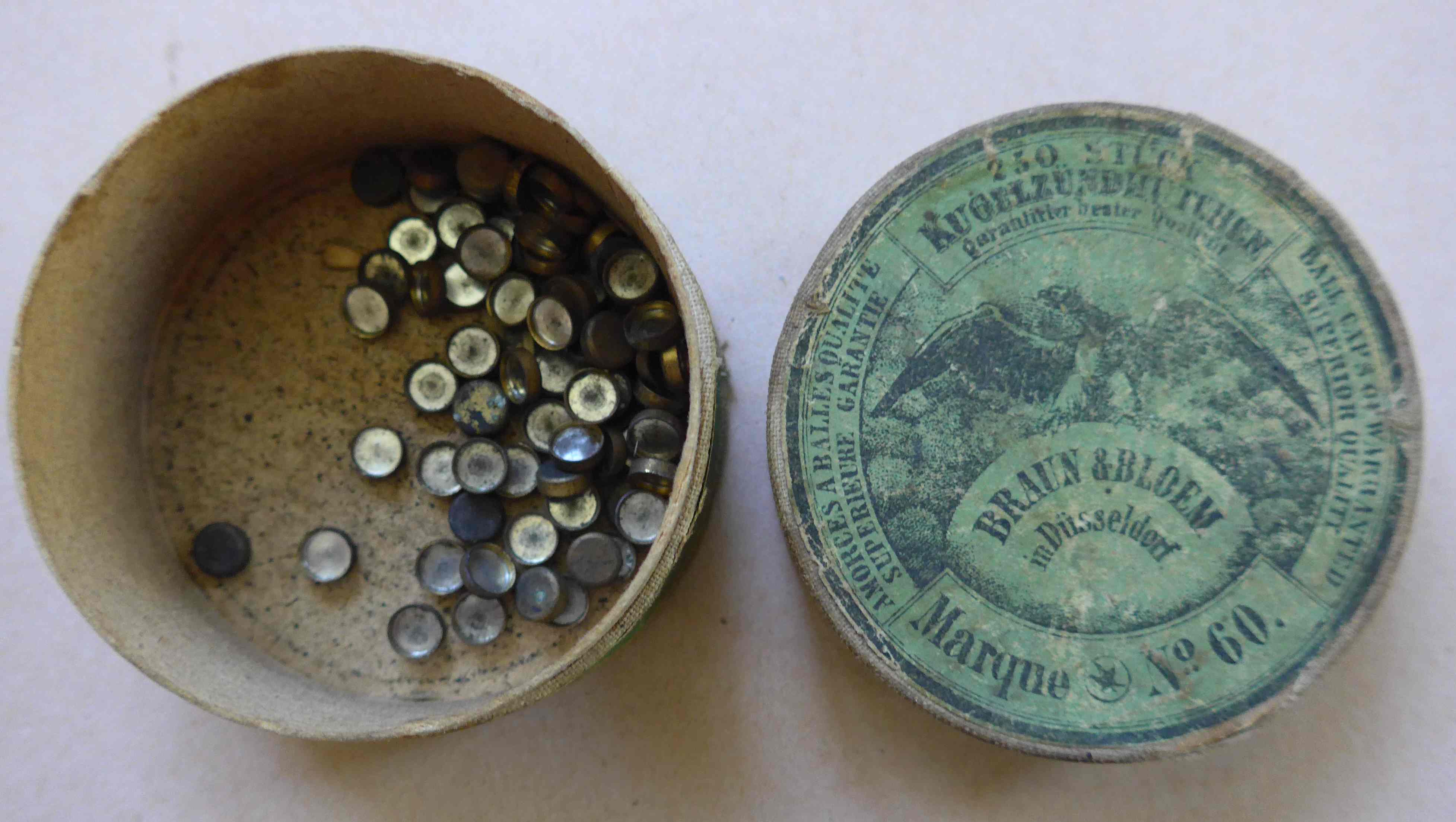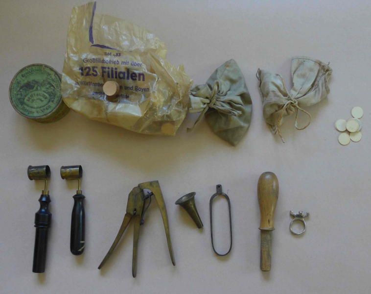 Die Ausrüstung stammt aus einem Nachlass eines Försters, der damit seine Schwarzpulver-Schrotpatronen geladen hat. Lieferumfang: 2 Füllbecher, verstellbares Volumen 1 Pulvertrichter 1 Zündhütchensetzgerät 1 Stopfer aus Holz 1 Halter (Fingerring?) Kal. 16 1 Klemme, dessen Einsatzzweck ich nicht kenne 1 Leinensäckchen mit grobem Schrot 1 Leinensäckchen mit feinem Schrot 10 Deckblättchen 79 Zünder (einen habe ich getestet, funktionierte noch) 46 Filz-Zwischenmittel (plus einige defekte) 1 Flasche Ballistol