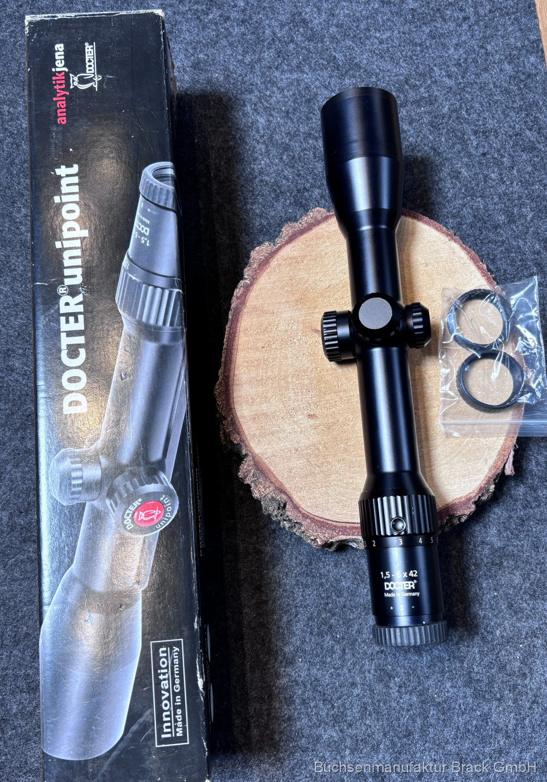 • Docter LeuchtpunktZielfernrohr Modell Unipoint 1,5‑6x42 mit Zeiss‑Innenschiene für stabile, werkseitig optimierte Montage.