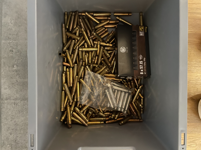 Biete 300 Hülsen, Kaliber 8x57 IS, Marke RWS. Sortenrein jedoch nicht losrein. Hülsen sind im Tumbler nass gereinigt. Hülsen wurden in einem Indoorstand im Rahmen der jagdlichen Ausbildung verschossen. 17 Stück Nickel.