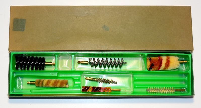 Putzzeug, unbenutzt, nur die Bürsten, die Zusammenstellung war für einen Drilling gedacht, 3 Schrotlaufbürsten mit 5mm Außengewinde, 1 Bürsten für großen Kugellauf (9-11mm) mit Außengewinde 5mm, 3 Bürsten für Kaliber um 7-9mm mit 3mm Innengewinde (bei der Messingdrahtbürsten fehlen im vorderen 3tel die Borsten), ungebraucht, die Putzstöcke sind nicht dabei
