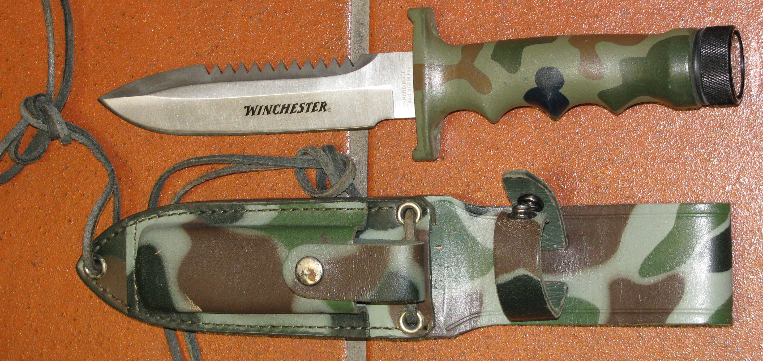 Zum Verkauf kommt ein Survival / Überlebensmesser mit " WINCHESTER " und Lederscheide