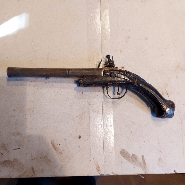 Steinschloss-Pistole, antik, Restaurationsobjekt oder Ersatzteilträger, Gesamtlänge 32cm, mit Gravuren, Schloss komplett aber eingerostet, siehe Fotos, auf Wunsch sende ich mehr Abbildungen