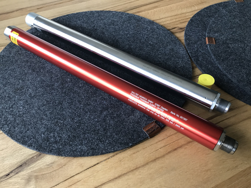 Sie bieten auf zwei 200 bar Kartuschen für Anschütz Pressluftgewehre, beide TÜV abgelaufen. Beide Kartuschen sind dicht und befinden sich optisch im sehr guten Zustand. Die rote sieht aus wie neu ohne jeglichen Minikratzer, die silberne hat am Gehäuse des Manometers vorn 2 kleine unbedeutende Kratzer, ansonsten auch top.