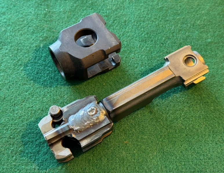 Der Stoßboden ist abgeschliffen, die Schlagbolzenbohrung ist verschweißt, der Verschlussträger ist unlösbar damit verbunden - freies Teil, da keine waffentechnische Funktion mehr möglich ist. Schlagbolzenhalter ist drin mitverschweißt. Eine Rolle ist für Anschauungszwecke eingesetzt.