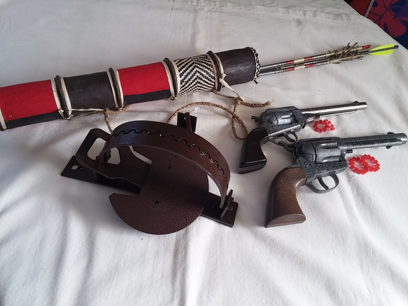 Hier ein paar Sachen für das Westernhobby. 2 Westernrevolver für Knallkapseln. Eine sehr alte originale Raubtierfalle, wie im wilden Westen verwendet