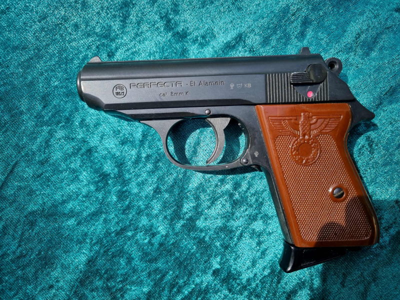 Biete eine gepflegte EL ALAMEIN Erinnerungswaffe / Schreckschusswaffe von Perfecta aus Sammlerhand an (Vitrinenstück). Es sind leichte Lagerspuren vorhanden (wer natürlich mit der Lupe sucht, der könnte u. U. eine Kleinigkeit finden). Recht tiefsitzende Laufsperre. Habe die Waffe selbst nie geschossen. Kein weiteres Zubehör vorhanden. Die Fotos sind Bestandteil der Artikelbeschreibung.