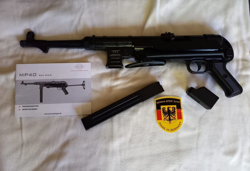 Schwere MP40 9mm P.A.K. mit 25 Schuss Magazin.Gas-Signal Schreckschuss Gewehr.Länge ca. 62cm mit ausgefahrener Schulterstütze ca. 83cm. Gewicht ca. 3350gr.Fast Vollständig aus Metall. Sieht aus wie echt.Unbenutzt wurde nie von uns abgefeuert. Ohne die sehr grosse Umverpackung war nur eine Schachtel ohne Aufdruck! Versand wie abgebildet Waffe Magazin und Anleitung. Kaufbeleg-Rechnung kann beigelegt werden. Neupreis 369,99 Euro. Wird Sorgfältig Verpackt. Versand als DHL-Paket 11,99 Euro. Altersnachweis erforderlich. Bezahlen per PayPal Freunde und Bekannte oder Banküberweisung. Privatverkauf! Keine Rücknahme oder Garantie! Verkauf erfolgt unter Ausschluss jeglicher Gewährleistung! Kein Versand ins Ausland!
