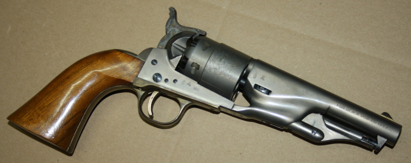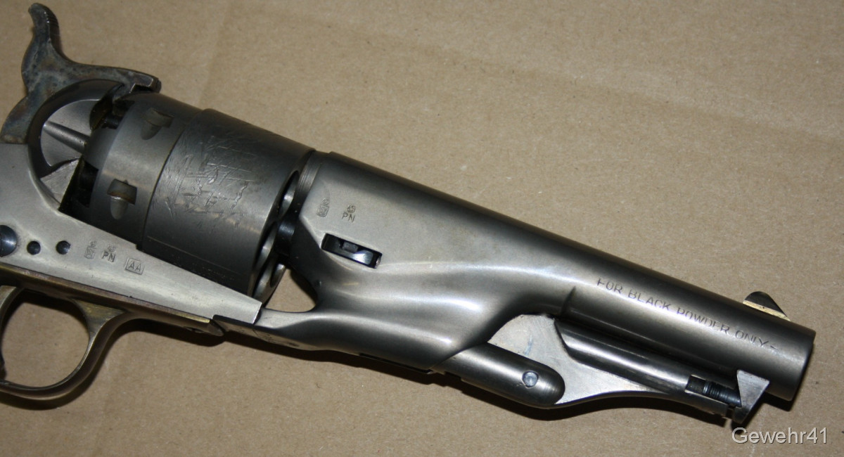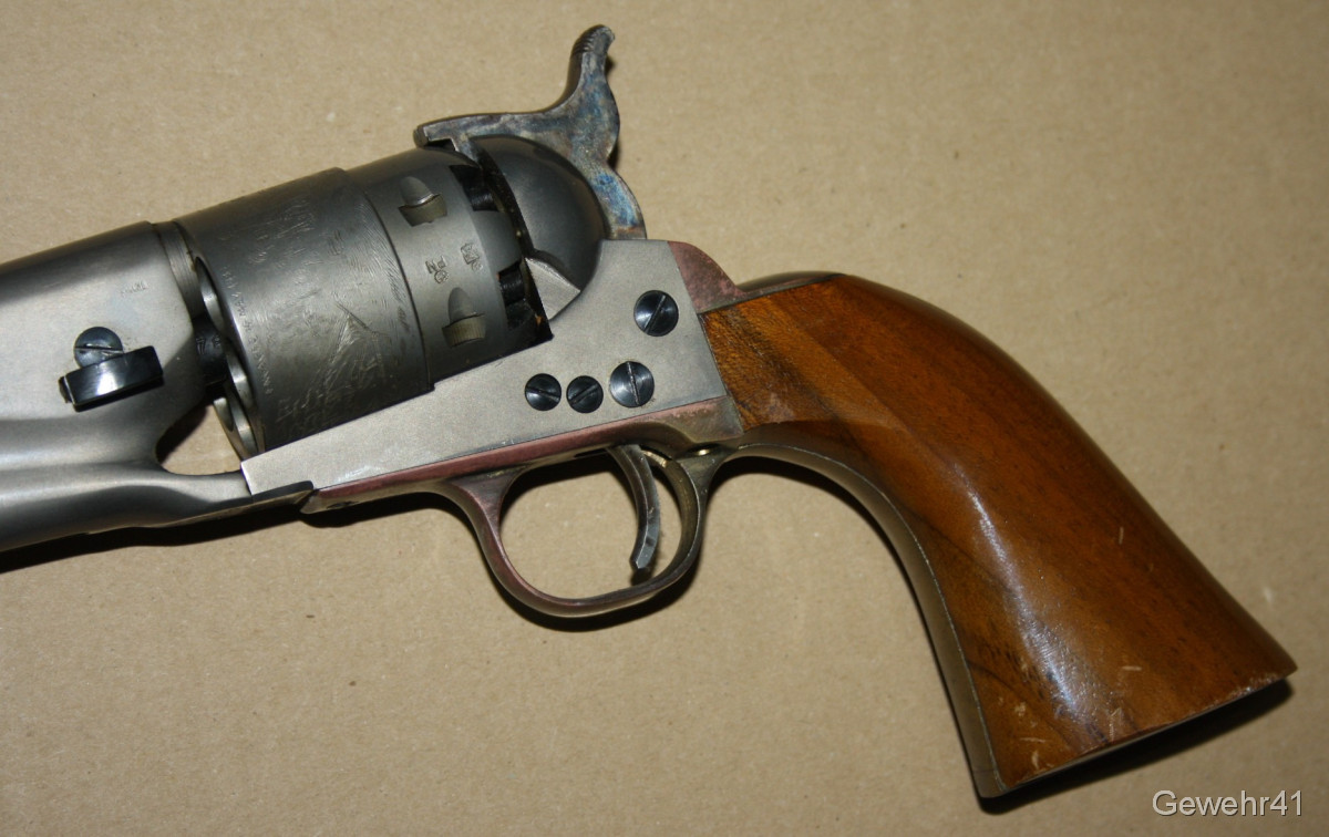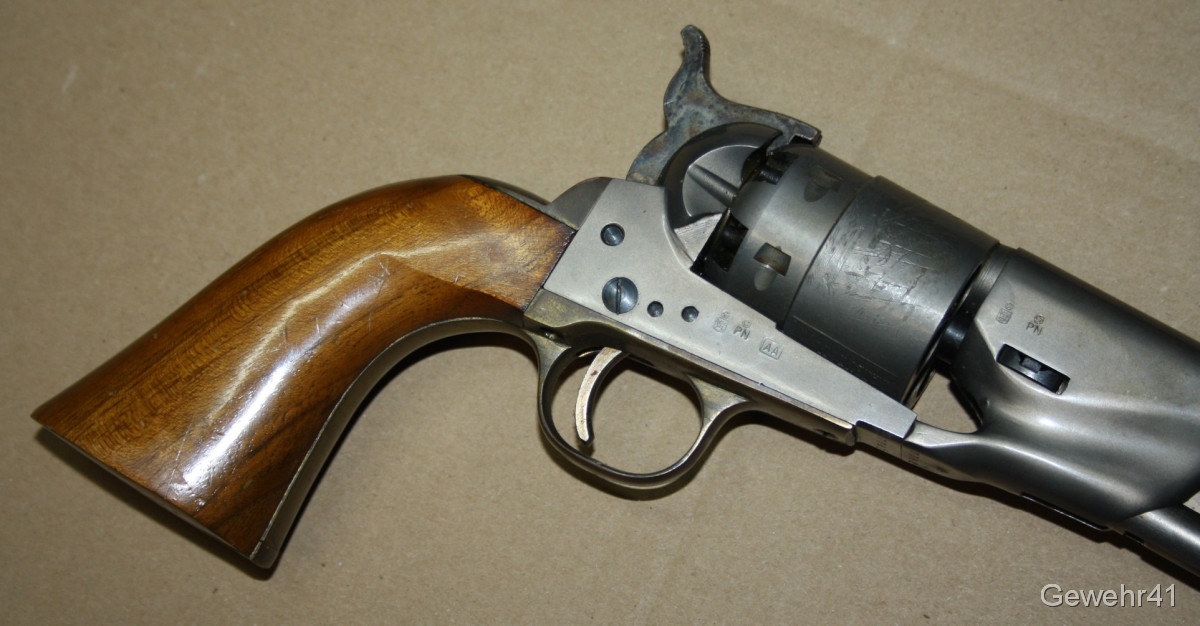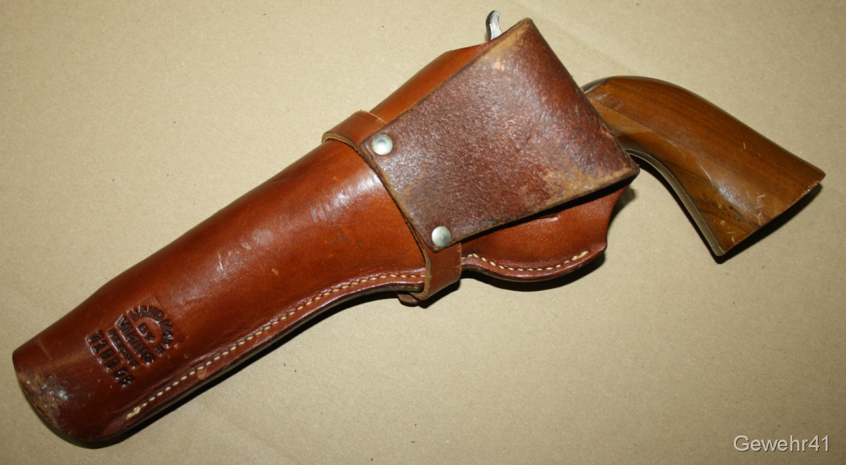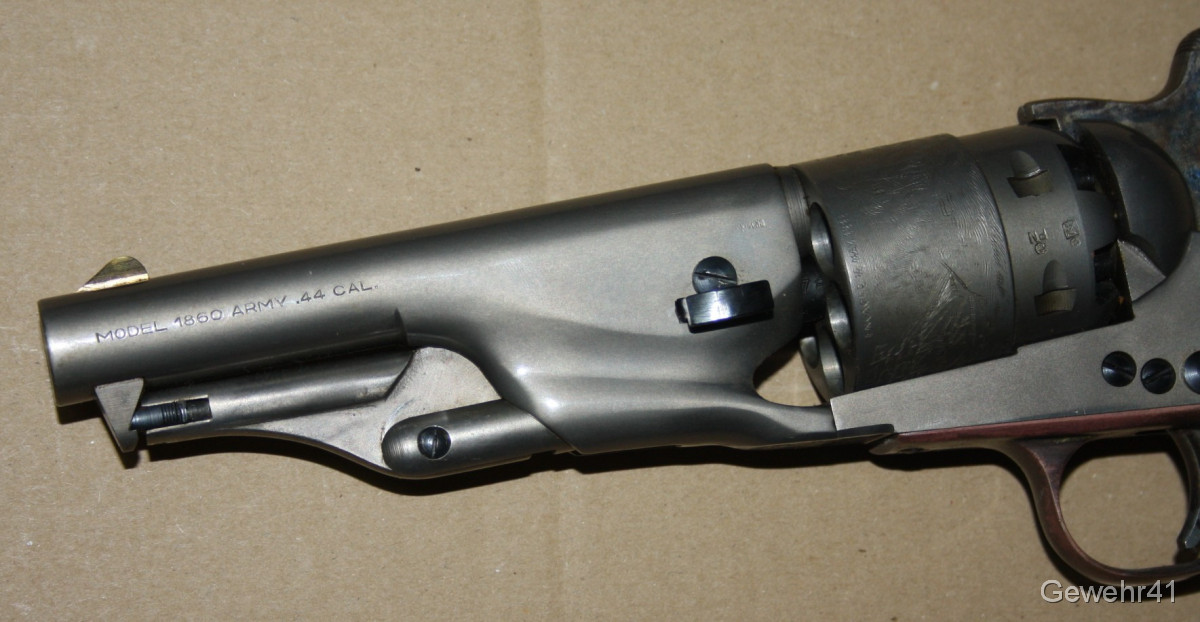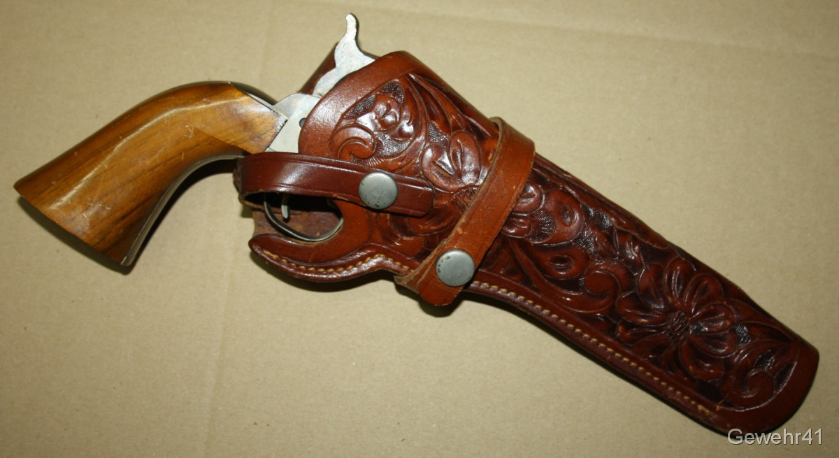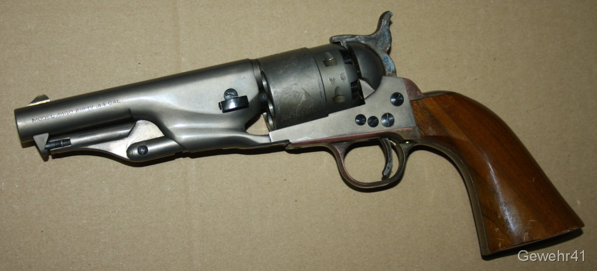 Sie bieten auf diesen Perkussions Vorderlader Revolver Modell "Army 1860" im Kal. 44. Er ist im absolut neuwertigen Zustand und stammt aus Erstbesitz. Wurde nie geschossen. Lauf und Funktion einwandfrei. Dazu gibts das handgefertigte Lederholster!