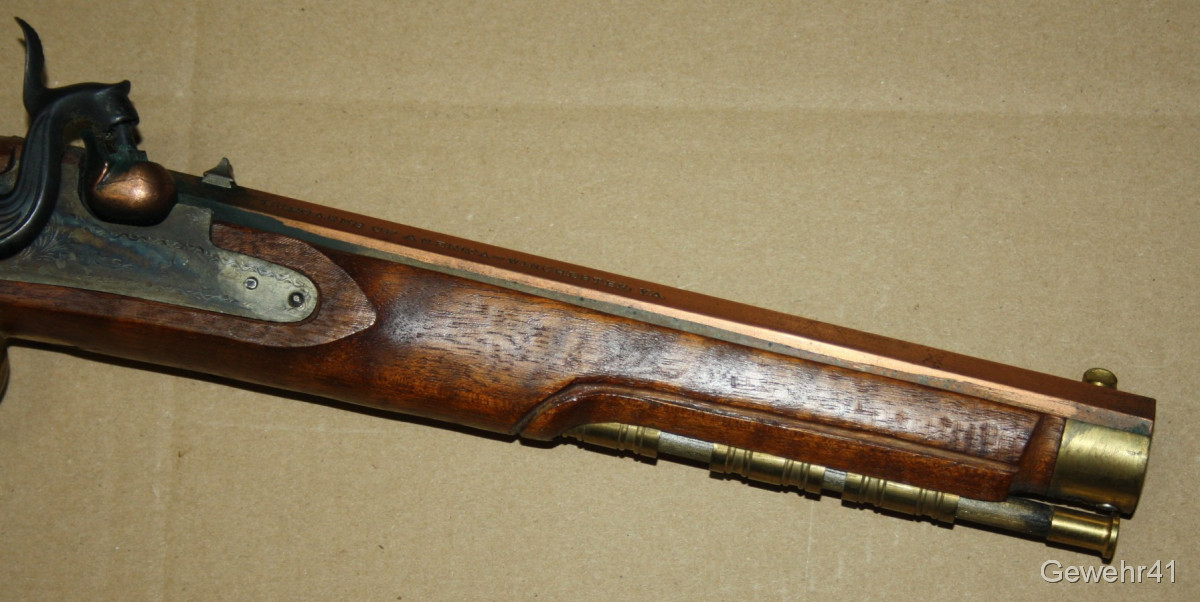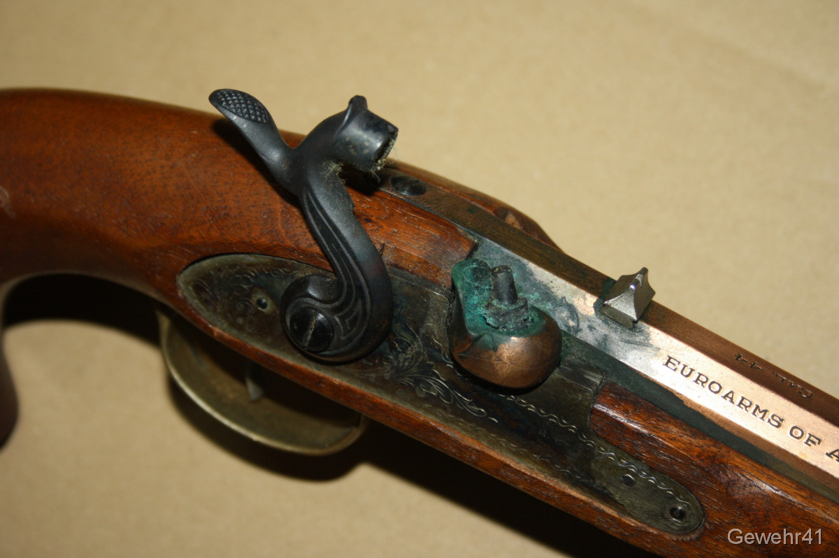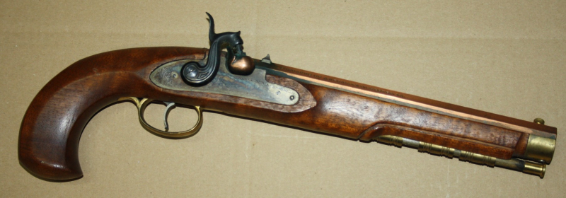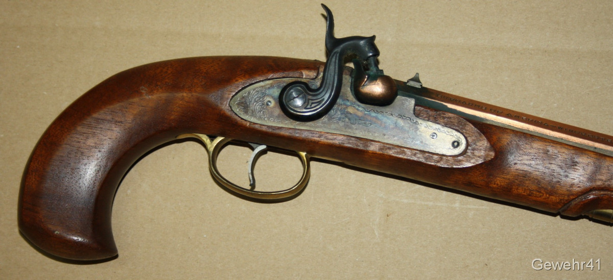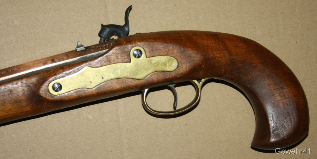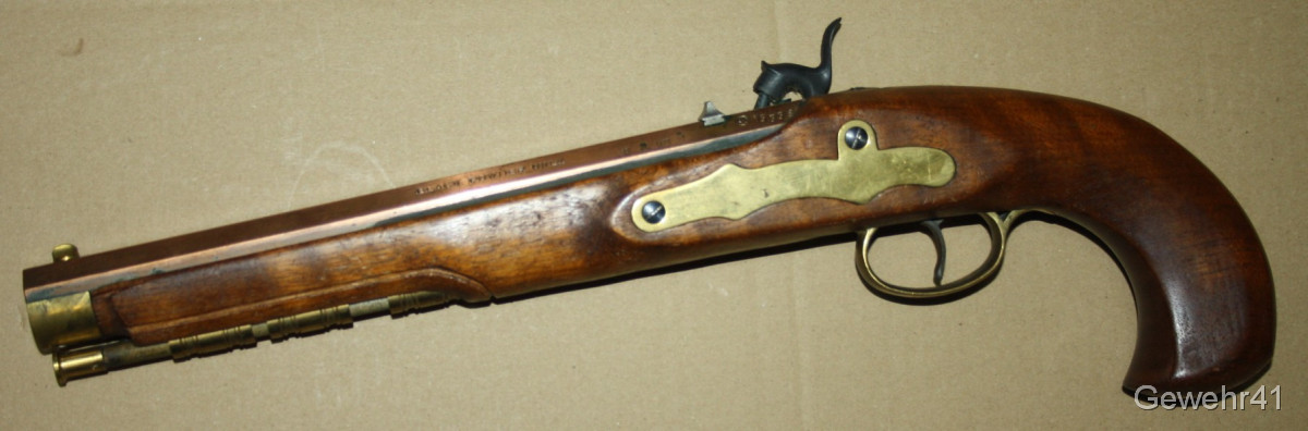 Sie bieten auf diese Perkussions Vorderlader Pistole Modell "Kentuckian" im Kal. 44. Sie ist im gutenZustand und gehört vom neuen Besitzer behutsam gereinigt. Lauf und Funktion einwandfrei.