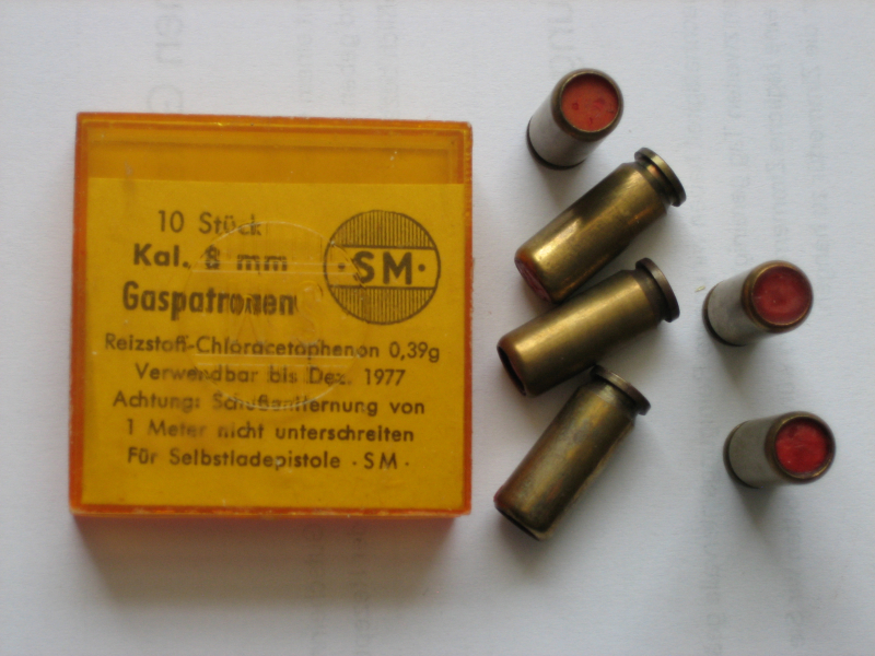 Aus Sammlungsauflösung wird angeboten -- Eine Schachtel (Restbestand) mit 6 Stk. Gaspatronen - mit Wachsverschluß - starke Ladung - Hersteller SM - 8 mm für Pistole - Ladung: o,35g Chlorace ... - Patronen wurden kühl und trocken gelagert - Haltbar bis 12/1977 -- Patronen können Oxidationsspuren aufweisen +++ Der Versand erfolgt mit DHL (unversichert). Die Versandkosten gelten nur für Deutschland. -- Kein Internationaler Versand -- Privatverkauf, daher keine Gewährleistung, Garantie oder Rücknahme. Bei Fragen einfach mailen.