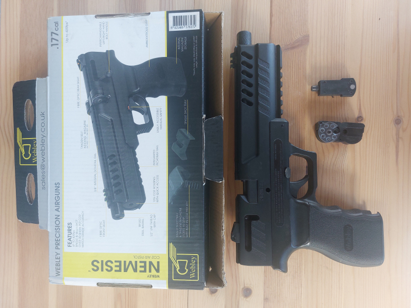 Zum Verkauf steht eine Webley Nemesis CO2-Luftpistole im Kaliber 4,5 mm Diabolo. Die Pistole ist ideal für Freizeit- und Hobbyschützen, die Wert auf Präzision und ein modernes Design legen.