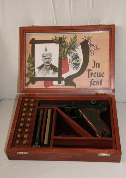 Die Kassette enthält noch einen Patronenblock für 18 Patronen im Kaliber 9 mm, zwei Fächer für Magazine sowie zwei Fächer für Putzzeug und andere Kleinigkeiten.