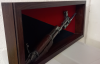 Die Waffe ist mit kleinen Nylonfäden an der Schachtel befestigt.