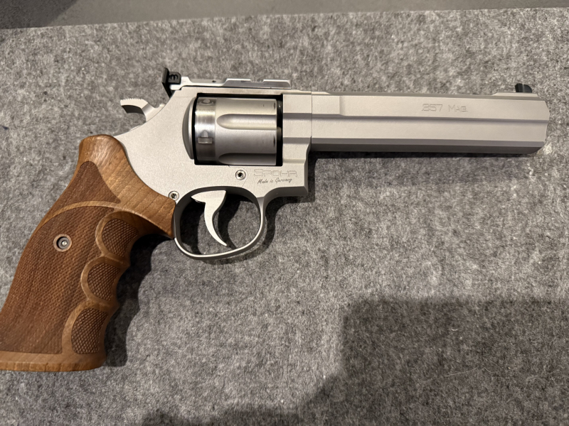 Aufgrund von der Aufgaben des Großkaliberschießens biete ich hier meinen Spohrrevolver in .357 Mag., 6 Zoll mit 9mm Wechselsystem an. Neupreis ohne Zubehör derzeit 3850 Euro. original Nill-Griff.
