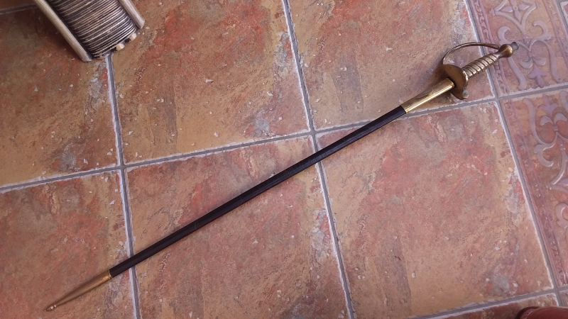 Zierlicher (preußischer?) Degen, Gesamtlänge ca.91 cm, Lederscheide mittig leicht geknickt, Naht in Ordnung, Metallteile angelaufen.