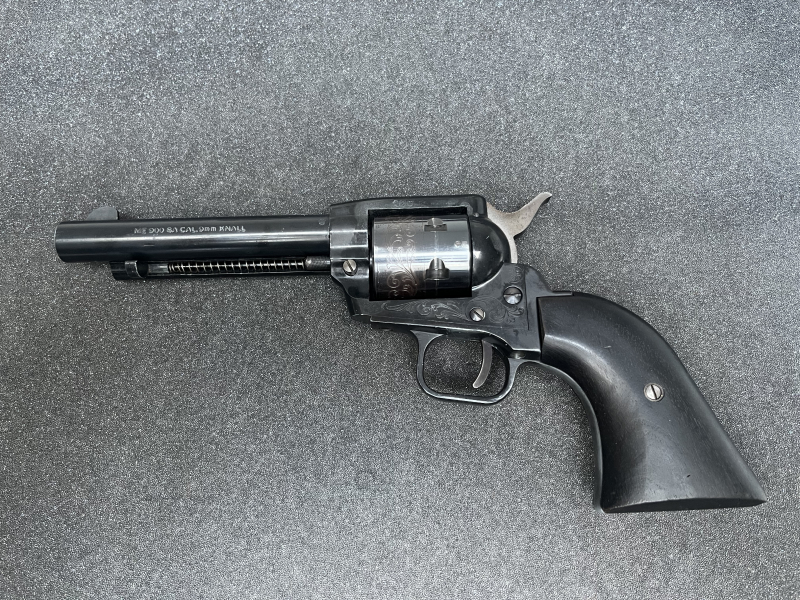 Sie bieten auf einen ME 900 SA im Kaliber 9mm Knall mit der PTB 217 und einem Beschuss von 1982. Der Revolver ist mechanisch in Ordnung, sieht aber seinem Alter entsprechend aus. Der Lauf hat ein Gewinde für einen Abschussbecher, dieser fehlt aber. Die Trommel lässt sich ausbauen.